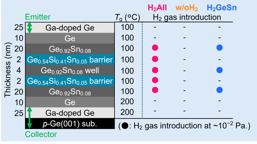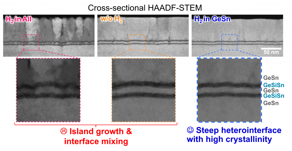 The research group achieved its breakthrough by introducing hydrogen gas during the layer formation process. They tested three different scenarios: 1) introducing hydrogen gas to both the two GeSiSn layers and three GeSn layers, 2) introducing no hydrogen gas, and 3) introducing hydrogen gas to only the three GeSn layers. In the last scenario, hydrogen gas restricted island growth and mixing between layers, resulting in a smooth and well-ordered double-barrier structure.