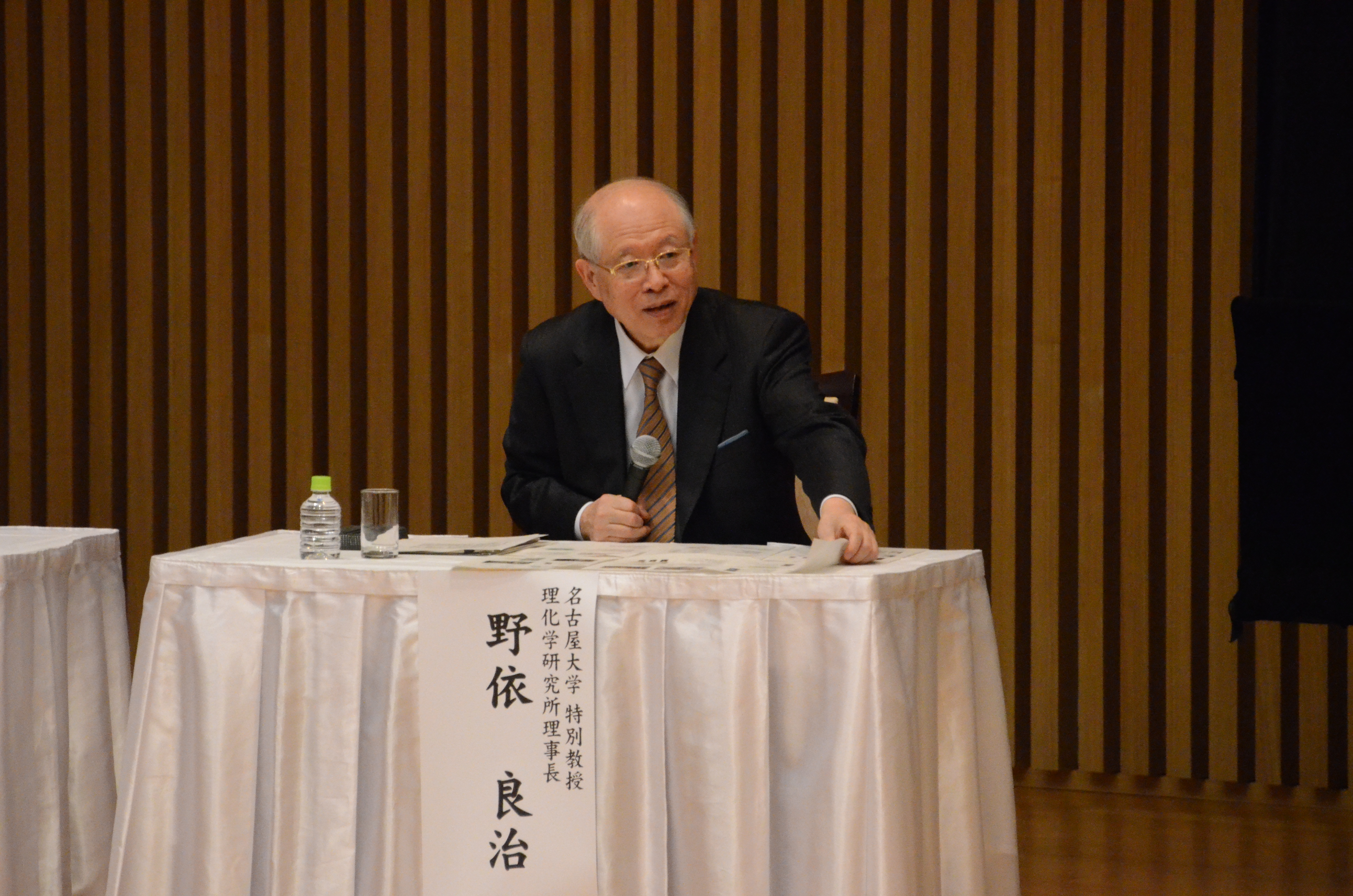 The Nagoya University Lecture Series was held on February 1, 2014, and University Professor Ryoji Noyori, a Nobel Laureate in Chemistry (2001), gave a lecture to an audience of over 1,200 people on the topic, "Where science goes"? He looked back over his life and brought up an issue regarding the manner in which universities work. Prof. Noyori described the twentieth century as the age of competition and the twenty-first century as the age of cooperation. He explained the importance of dialogue and cooperation between universities and society, and declared that the mission given by society to universities is to develop innovations for a better society. He described his critical feelings against current academia and asked researchers to be much humbler to the public. He closed the lecture with a message to the younger generation asking them to think of society in the next generations.