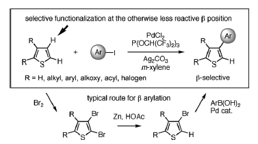 Ueda has risen to challenge posed by this difficult problem. Her research program is ideal chemical synthesis through C-H transformation. The direct C-H bond arylation reaction of arenes or heteroarenes has become an emerging methodology for making privileged biaryls and heterobiaryls. She has succeeded in developing a new catalyst for a couping reaction of thiophenes (Fig. 3) with iodoarenes. This catalyst can directly and selectively functionalize the β-carbones of thiophene ring (Fig. 4). Previous synthetic approaches have relied on three consecutive catalyzed reactions. Ueda also shows that the catalytic system can apply to synthesize the compound which is a potential drug candidate for treatment of Alzheimer’s disease and Tetraarylthiophenes which may be used as an organic material.