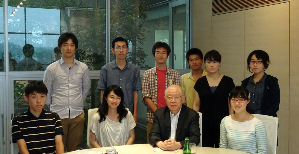Since January 2013, University Prof. Ryoji Noyori, a Nobel Laureate in Chemistry (2001), has contributed numerous articles to "Kamitsubute" in Chunichi Shimbun. Based on these articles, he holds regular academic discussions with students at Nagoya University. At the Sixteenth Noyori Academy Salon, held on July 8, 2015, Prof. Noyori and six students from different academic fields at Nagoya University discussed the topic "Globalization and Internationalization." Explaining the difference between globalization and internationalization in "Kamitsubute," Prof. Noyori claimed that the important element for accomplishing international research is cooperation with each other while respecting the values of diverse cultures.