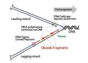 Okazaki fragments are short DNA fragments that are temporarily produced during DNA replication at the lagging-strand.DNA replication is started by separating the double helix by DNA helicase. Two complementary single-stranded DNA are formed, which will become templates for DNA synthesis. One of the single DNA strands is replicated continuously (leading-strand), but this is not possible for the other strand (lagging-strand). It is because DNA polymerase, the enzyme synthesizing new DNA, extends DNA strands in one direction only (from 5′ to 3′). In the process of lagging-chain production, whose overall direction of elongation is from 3′ to 5′ Okazaki fragments are produced first in the direction opposite to that of fork progression and are later connected to form a complete long strand.