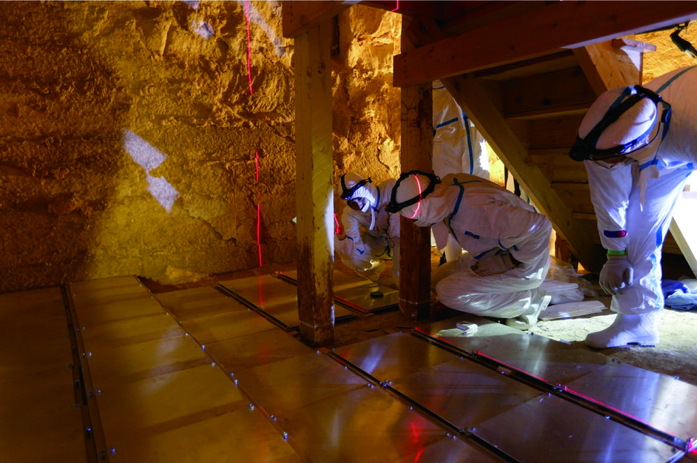 Installation of nuclear emulsion detectors inside the Bent Pyramid at the Dahshur necropolis in Egypt. Aluminum plates, which fix nuclear emulsions, were placed horizontally on the ground inside the lower chamber to measure cosmic rays to validate imaging of the upper chamber.