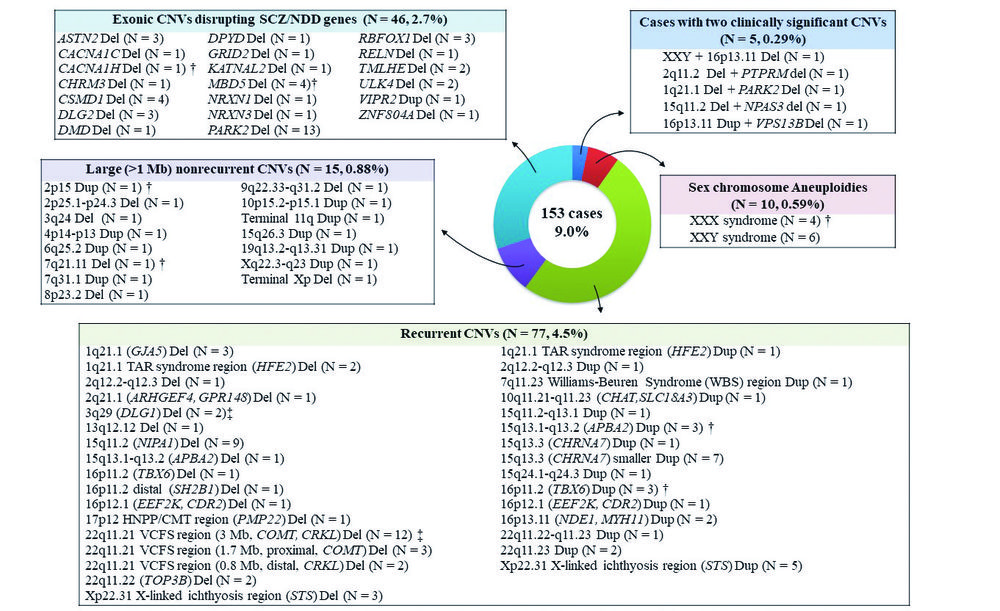 Figure shows clinically significant (or pathogenic) copy number variations (CNVs) identified in patients with schizophrenia. 158 CNVs were detected in 153 of 1699 patients (9.0%). Five patients had two clinically significant CNVs. The CNVs were classified into four categories: 1) sex chromosome aneuploidies, 2) recurrent CNVs, 3) large nonrecurrent CNVs, and 4) exonic CNV disrupting SCZ/NDD genes. Number and % frequency of each category are presented in parentheses. † indicates that de novo CNV was detected in one patient, and ‡ indicates that de novo CNV was detected in two patients. Abbreviations: Del: deletion; Dup: duplication; NDD: neurodevelopmental disorder; SCZ: schizophrenia
