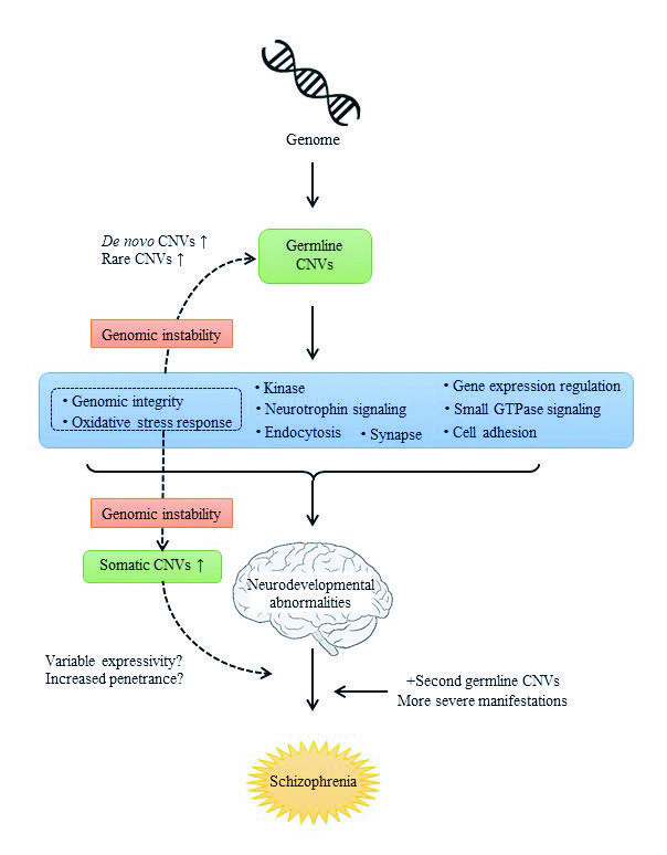 In pathogenesis of this disorder, nine pathways (oxidative stress response, genomic integrity, gene expression regulation, cell adhesion, neurotrophin signaling, kinase, synapse, small GTPase signaling, and endocytosis) are affected by CNVs. Disruption of genomic integrity and oxidative stress response induces genomic instability, which is involved in germline CNV formation and somatic CNV formation in neurons. The former account for an increased rate of de novo or rare CNVs and the latter for the variable expressivity of CNVs.