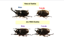 Most people know that the exaggerated horn is unique to male beetles, yet no-one has yet demonstrated what gene determines its formation. The group focused on a gene regulating sexual differentiation in insects,doublesex (dsx), and discovered that beetles carry the gene too. When the function of the gene is inhibited in larvae, males grow a shorter horn; females also grow a short horn, which is never observed under natural conditions. Furthermore, those beetles, both male and female, lose genital function and show intersexual phenotypes.