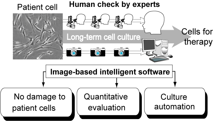In recent cell culture technologies, in order to gain a sufficient number of cells with which to treat defects in regenerative medicine, a limited number of the patient’s cells must be multiplied outside the body. During such long-term "artificial" culturing of cells, the activities of cells can be enhanced for greater medical effect. However, it is known that it is difficult to precisely control such cellular activity changes using classical cell research techniques. The greatest dilemma in regenerative medicine has been that, although many highly reliable cell evaluation techniques which previously supported all the cell sciences exist, they cannot be easily used on cells intended for cell therapy, as they "damage" the cells to be used afterwards for therapy. Therefore, the present quality control method for checking cellular status had been limited to the most basic method: manual microscopic observation by culture experts. Such reliance on manual checks has been the critical bottle-neck in the industrialization of regenerative medicine, because manual efforts are "laborious" and "not quantitative". To reduce the onerous tasks that are pushing up the cost of regenerative therapies, machinery companies are devoting much effort to automating the manual procedures. However, "intelligence programming" with which to regulate the robots had not been developed to any extent.