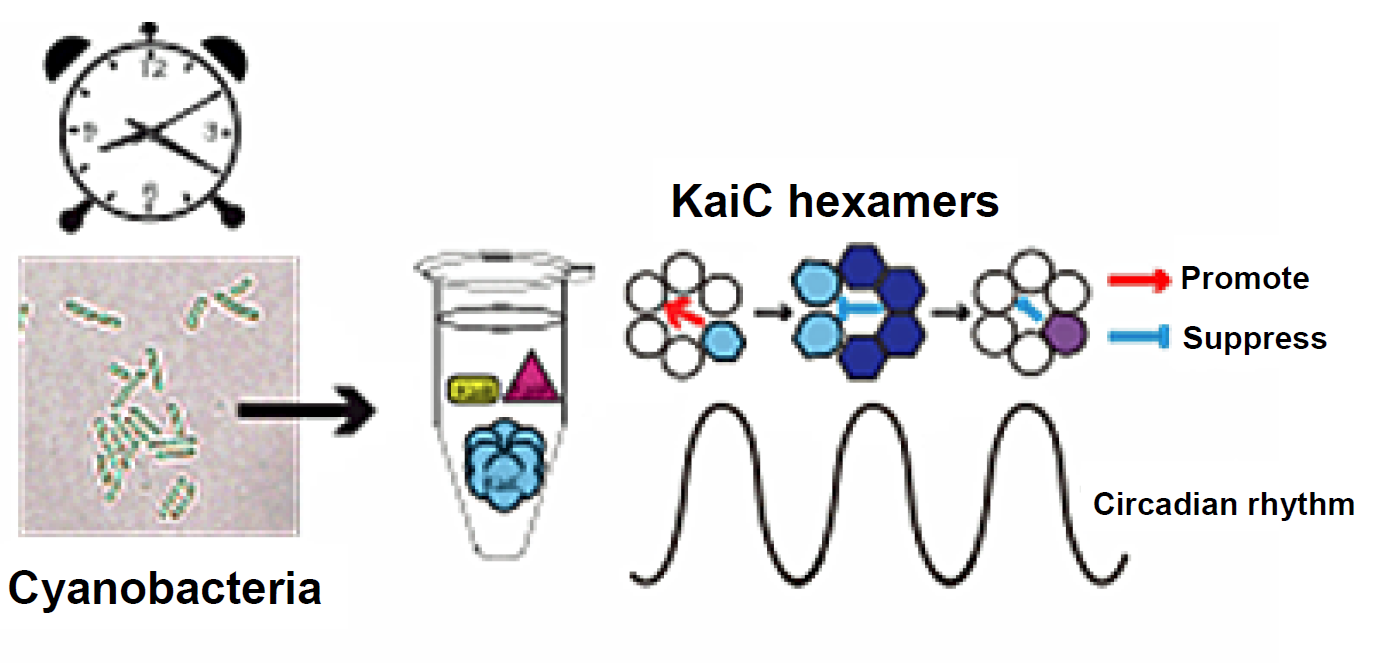 Cyanobacteria are the simplest form of life with a circadian clock. They possess three clock proteins, KaiA, KaiB, and KaiC, which function as biological timekeepers. KaiC sets a circadian rhythm by activating and deactivating itself regularly. KaiC has a ring structure consisting of six protein subunits. The protein subunits are activated by external stimuli, and the ring structure is believed to trigger the activation and deactivation of the clock protein. However, a detailed mechanism underlying this process has not yet been elucidated.