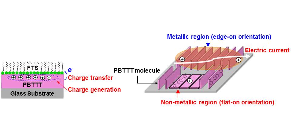 To this end, Prof. Tanaka’s research group focused on the electronic structure of polymers to clearly elucidate the mechanism underlying the current flow. The group carried out the doping of PBTTT thin film, a polymer with a regular array and high crystallinity, with fluorinated alkyl silane (FTS) in order to induce electron transfer from PBTTT to FTS. As a result, positive electronic charges were generated on PBTTT and produced electronic current. In principle, the molecules in PBTTT thin film exhibit well-ordered edge-on molecular orientations. However, with FTS doping, a small part of the molecules changed its orientation to a flat-on orientation. Prof. Tanaka’s group analyzed the precise position of the electric current flow in this state using electron spin resonance (ESR) technique, which measures the electronic concentration, motional condition, and molecular orientations at the microscopic level. Consequently, it is elucidated that molecules in the edge-on orientations have regular arrangement and allow electron flow, while those in the flat-on orientations have irregular arrangement and resist the flow of electrons. Therefore, they discovered that the high conductivity in polymers could be attributed to regular arrangement of molecules (high crystallinity). The research outcome revealed the relation between crystallinity and metallic conductivity and suggested that large crystals and thin films with more uniformity can exhibit increased conductivity. It is expected that the findings reported in the study will advance the performance of organic electronics materials toward the realization of high conductive polymers in solar batteries and organic EL.