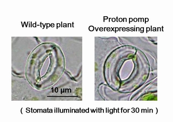 Previous studies have determined that three factors are required for light-induced stomatal opening including the blue light receptor phototropin, a proton pump, and potassium channels. Prof. Kinoshita’s research group produced three different Arabidopsis thaliana plants, each overexpressing phototropin, proton pumps, and potassium channels, respectively, and observed stomata and growth in each plant. As a result, stomatal opening in the plants with overexpressed phototropin and potassium channels was equivalent to that in wild-type plants, whereas that in plants with overexpressed proton pumps was enhanced by 25%, compared to that in the wild-type. The enhanced opening led to approximately 15% increased CO2 uptake, and the plants grew to approximately 1.4-1.6 times its wild-type equivalent. The novel technique proposed in this research required genetic modification; however, Prof. Kinoshita is currently addressing the development of a new method to activate the proton pump using a compound to enhance plant production. It is widely expected that their studies will contribute to increasing food production and environmental improvements in the future.
