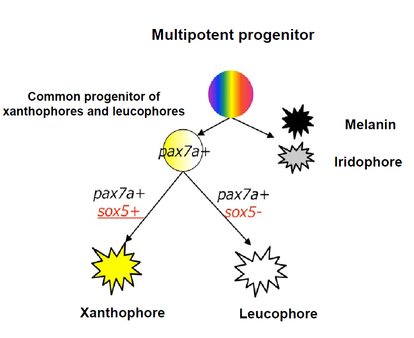 Body coloration and patterns are determined by pigment cells in living organisms. Previous studies have elucidated the mechanism of generating melanin-producing melanocyte which is common in all vertebrate animals including mammals. However, the methods of formation of other pigments, such as iridophores, xanthophores, and leucophores, have not been explained.