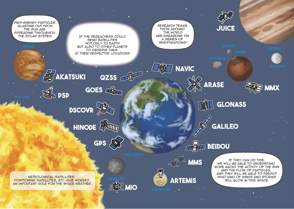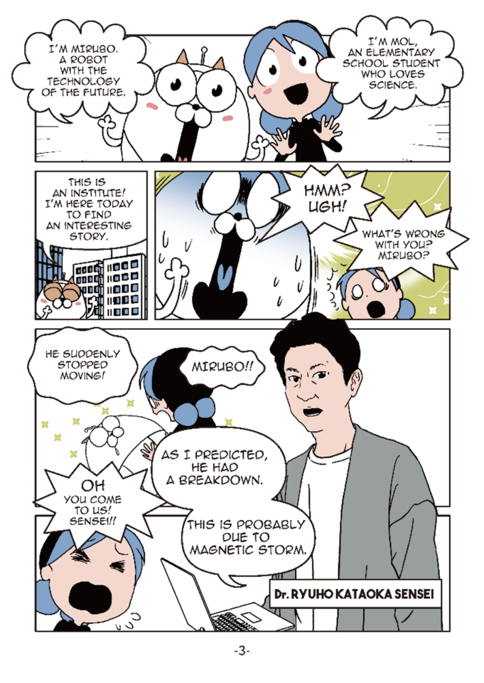 Space weather is natural phenomena such as solar flare, CMEs, geomagnetic storms, and their effects on satellites, astronauts, navigation, and telecommunications. In this booklet, space weather phenomena, their impact on social life, and space weather forecast are explained in an easy-to-understand manner, mainly for junior and senior high school students. The manga was created by a science manga artist Hayanon, who has been working on this series since 2002, and her production office, Science Manga Studio. The series explores "the space weather world" with Hayanon’s original characters, "Moru," a girl who loves science, and "Milbo," a robot dog.