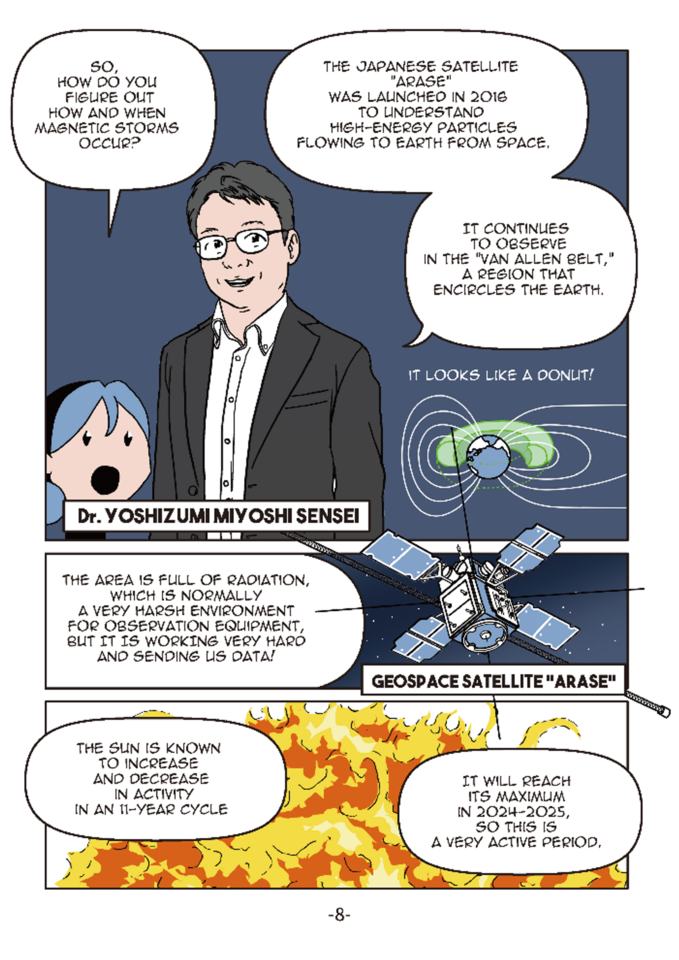 The Solar-Terrestrial Environmental Laboratory, which is now part of ISEE, has been producing this manga series, "…What’s that? series in collaboration with Hayanon-san. This time, the manga "What’s Space Weather? was supported by a Grant-in-Aid for Scientific Research (KAKENHI) from JSPS (Grant-in-Aid for International Leading Researchers, Project No. 22K21345, known as the PBASE Program). The production was supported by Prof. Kazuo Shiokawa, Director of the Space and Earth Environment Research Institute (SCOSTEP President), Prof. Yoshi Miyoshi (Bureau member of SCOSTEP), and Associate Prof. Ryuho Kataoka of the National Institute of Polar Research. This booklet will be further distributed to the kids in the world through the Scientific Committee on Solar-Terrestrial Physics (SCOSTEP).
