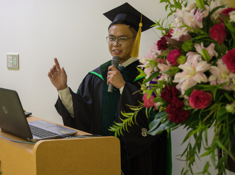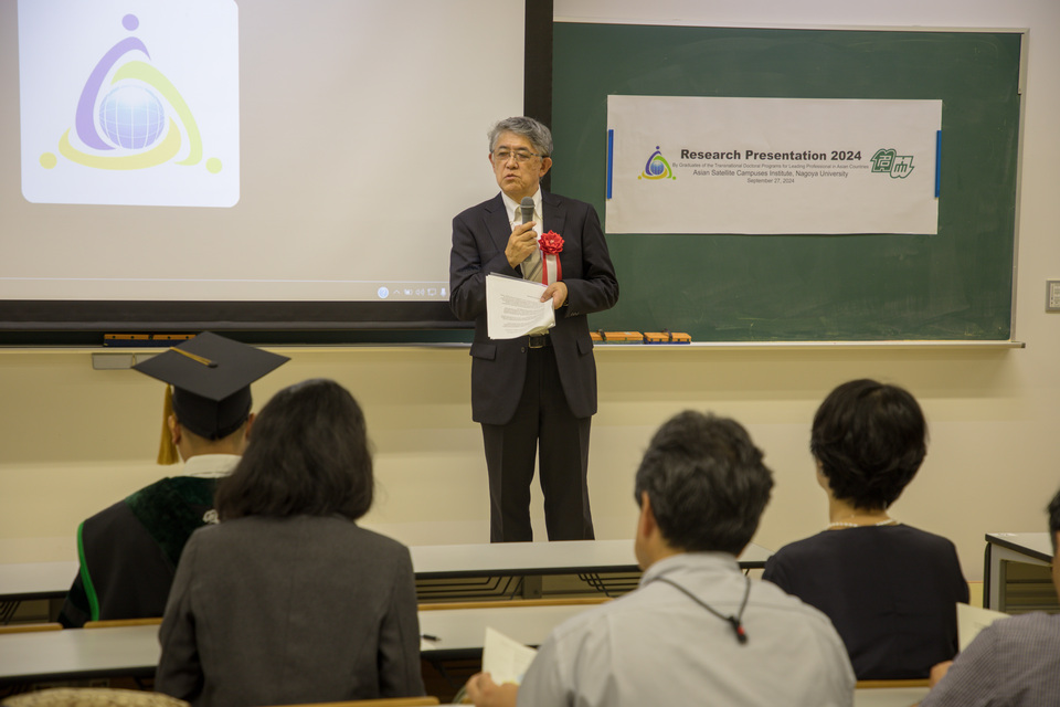 The Asian Satellite Campuses Institute (ASCI) hosted a special graduation ceremony on 27 September 2024 to honour four graduates who earned their doctoral degrees in the Transnational Doctoral Programs for Leading Professionals this academic year. The event took place at the Graduate School of Bioagricultural Sciences. Professor Akira Yamauchi of ASCI introduced the graduates: Dr. Fayaz Said Hafizullah and Dr. Frozanfar Muhammad Kamel (both in Medicine from Afghanistan), and Dr. Hadji Cortez Jalotjot and Magsino Landicho (both in Bioagricultural Sciences from the Philippines). Congratulatory speeches were given by Nagoya University President Naoshi Sugiyama, Vice President Shogo Kimura, Dean Hiroshi Kimura of the Graduate School of Medicine, and Dean Mikio Nakazono of the Graduate School of Bioagricultural Sciences. After that, the four graduating students delivered presentations on their doctoral research.