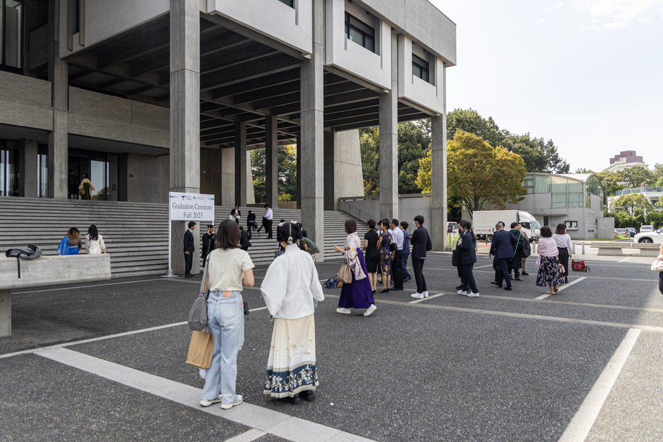 The 241 graduates, including 186 international students from around the world, headed to the campus in the late summer sun before entering the auditorium to receive their diplomas and be congratulated by President Naoshi Sugiyama.
