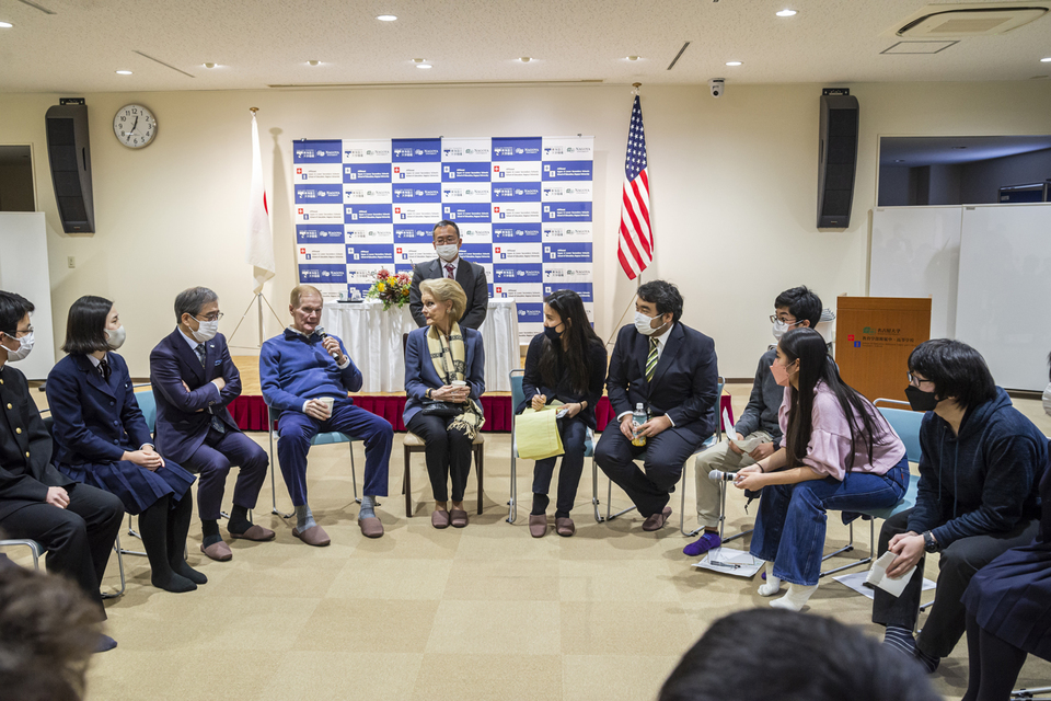 Mr. Nelson was joined by Nagoya University President Sugiyama, researchers from the Nagoya University Institute for Space-Earth Environmental Research and Kobayashi-Maskawa Institute for the Origin of Particles and the Universe, and teachers from the high school. They talked about Nagoya University’s contributions to collaborative research with NASA and JAXA, and the importance of increasing women and girls’ participation in science.