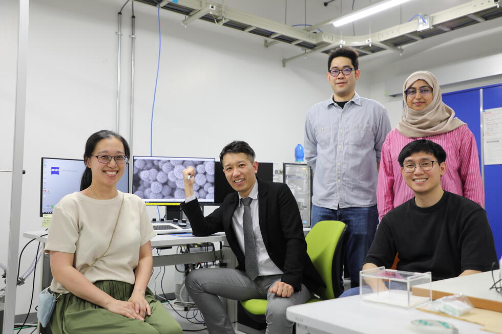 Professor Yusuke Yamauchi with members of his lab: (L-R) Designated Assistant Professor Mandy Hei Man Leung, Distinguished Professor Yusuke Yamauchi, Associate Professor and lab co-leader Yusuke Asakura, Assistant Professor Azhar Alowasheeir, and Designated Assistant Professor Ngoc Nam Ho (seated right). Credit: Merle Naidoo, Nagoya University