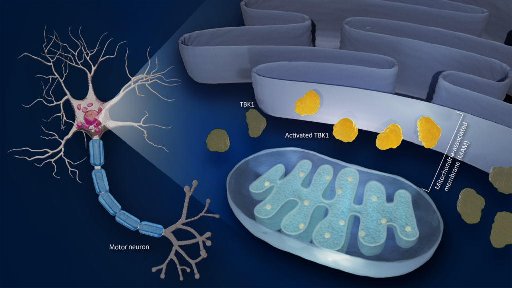 Top image: Research revealed that diminished activities of an enzyme called TBK1 in mitochondrial-associated membrane (MAM) reduces motor neurons’ tolerance to stressors, which is known to be causative factors in ALS.