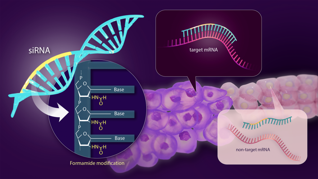 Top image: A formamide modification (yellow) to a therapeutic agent siRNA (blue) prevents siRNA to bind to non-target mRNA, which allows for treatment with less side effects.