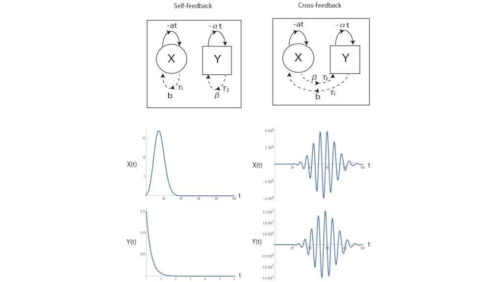 Top image: Comparison of self-feedback (left) and cross-feedback (right) wiring configurations. The amplitude of the dynamics is indicated by the values on the vertical axes, demonstrating a pronounced enhancement.(credit: Toru Ohira)