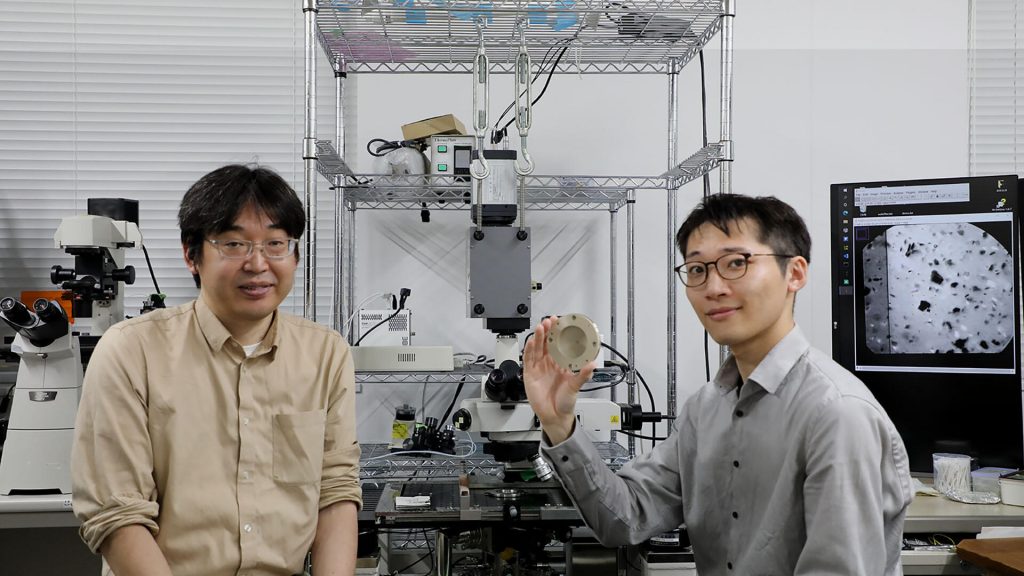 Top image:Professor Takayuki Hoshino (L) and Ken Sasaki (R) from the Biocybernetics Lab at Nagoya University have used electron beams to create electric fields that sort graphene oxide sheets, a technique that could aid in pollution cleanup. Credit: Merle Naidoo, Nagoya University