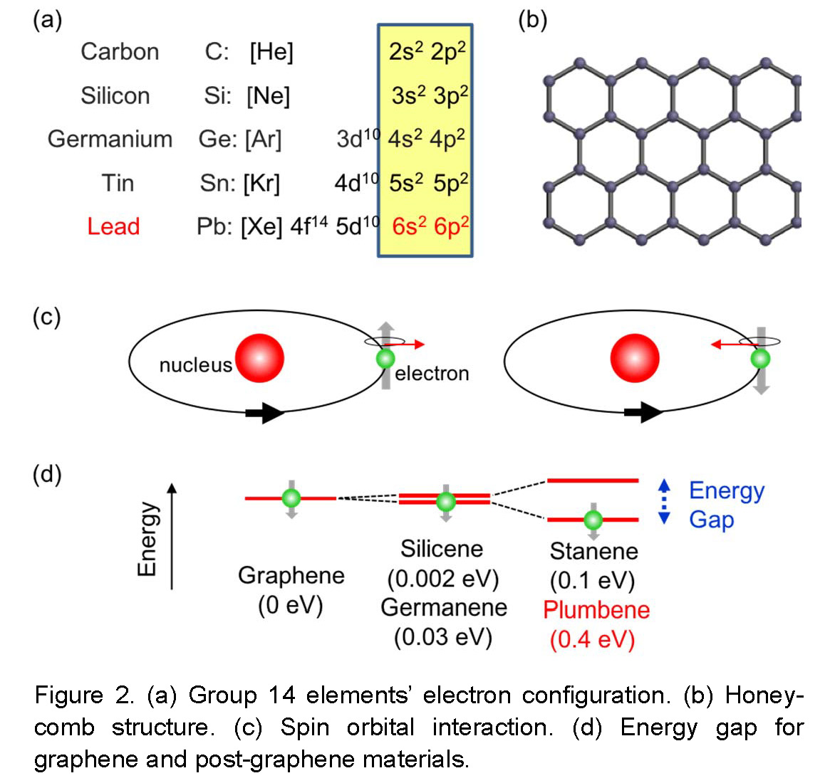In particular, the up-to-now purely theoretical possibility of a lead-based 2D honeycomb material, called plumbene, has generated much attention because it has the largest spin-orbit interaction, due to lead’s orbital electron structure and therefore the largest energy band gap (Fig. 2), potentially making it a robust 2D topological insulator in which the Quantum Spin Hall Effect might occur even above room temperature.
