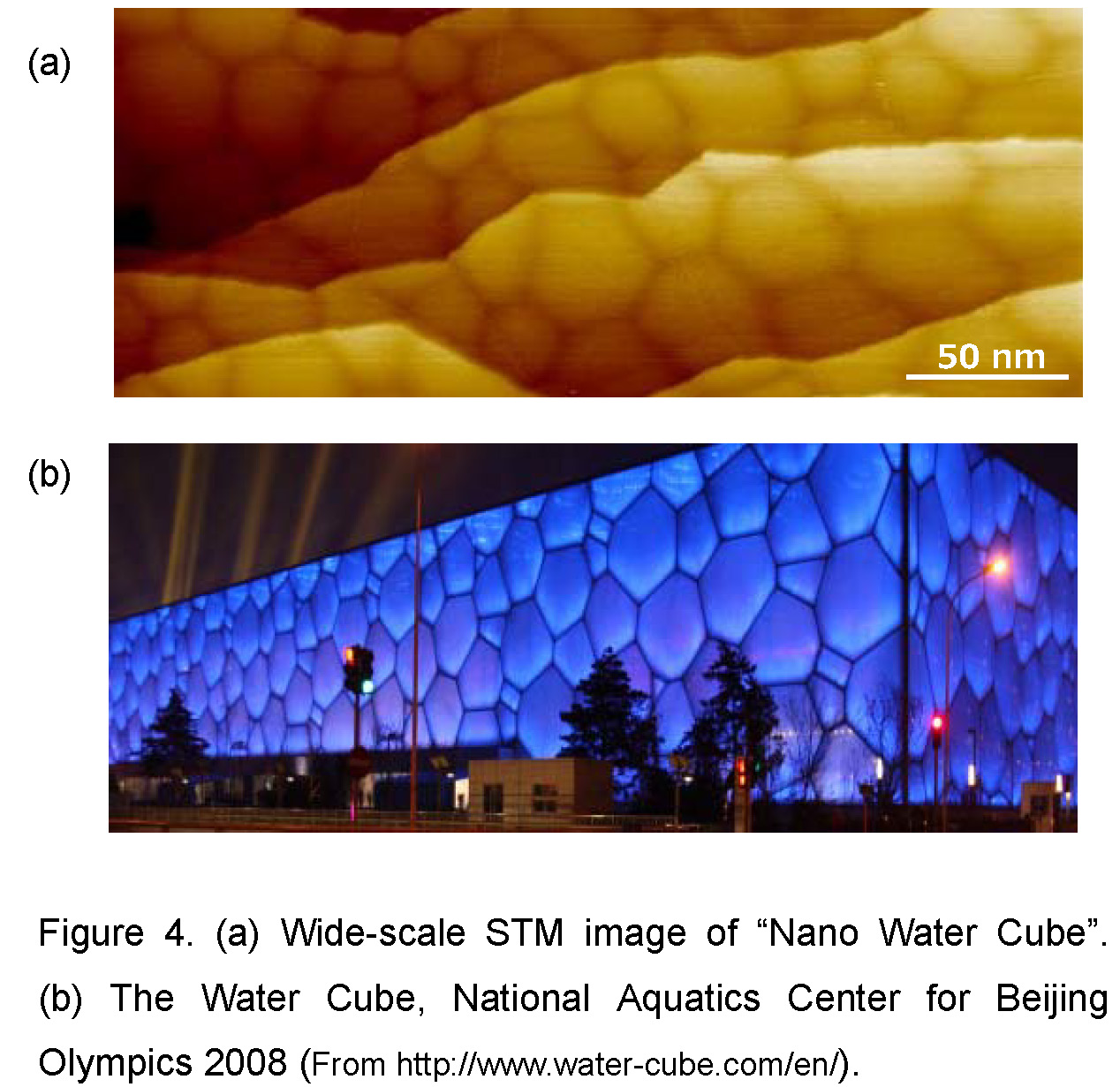 Surprisingly, beneath the plumbene, a palladium-lead (Pd-Pb) alloy thin film forms with a bubble structure (Fig. 4 (a)) reminiscent of a Weaire-Phelan structure (which partitions space into cells of equal volume with the least total surface area of the walls between them, solving the "Kelvin Problem"). The Weaire-Phelan structure was the inspiration for the design of the Beijing National Aquatics Centre ("Water Cube") of the 2008 Olympics in Beijing (Fig. 4 (b)).