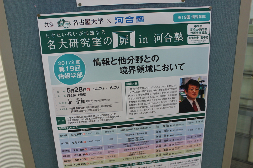 "Door to Nagoya University Labs in Kawaijuku" is an event produced and organized by the joint effort of Nagoya University and Kawaijuku. It’s an opportunity for prospective students and their parents to hear lectures from Nagoya University’s team of top scientists regarding their work with cutting-edge technology. This year marks the fourth year of the event, and they plan to hold lectures six times in this year alone. On May 25th, I listened in on the research overview presented by the department of information science. Professor Eisuke Kita of the Graduate School of Informatics at Nagoya University and graduate students in the program gave the 19th lecture in a series titled "Regarding the Boundaries of Information and Other Fields of Knowledge."