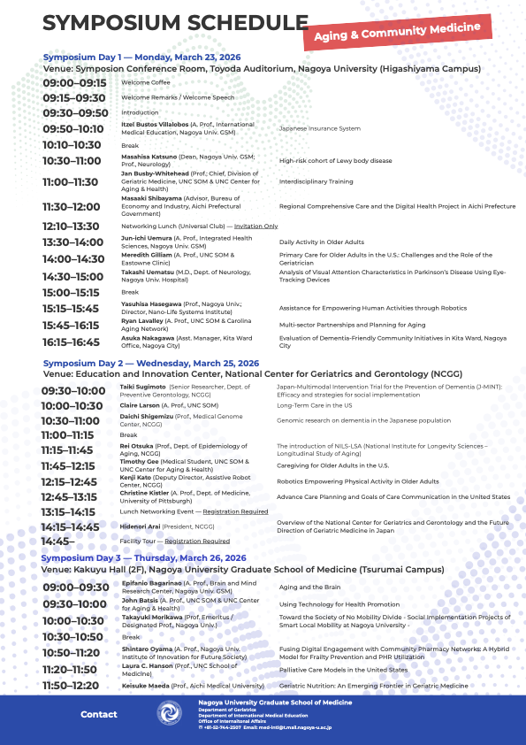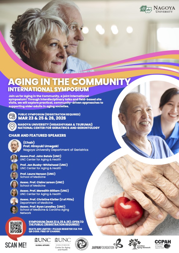 This symposium brings together experts from Japan and the United States, centered on Nagoya University and the University of North Carolina at Chapel Hill, to discuss Aging in the Community from research, educational, and clinical perspectives.