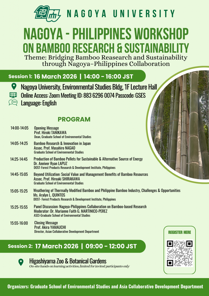 As part of their continuing collaboration, the Graduate School of Environmental Studies (GSES) and the Asia Collaborative Development Department will hold the Nagoya–Philippines Workshop on Bamboo Research and Sustainability on March 16-17, 2026.